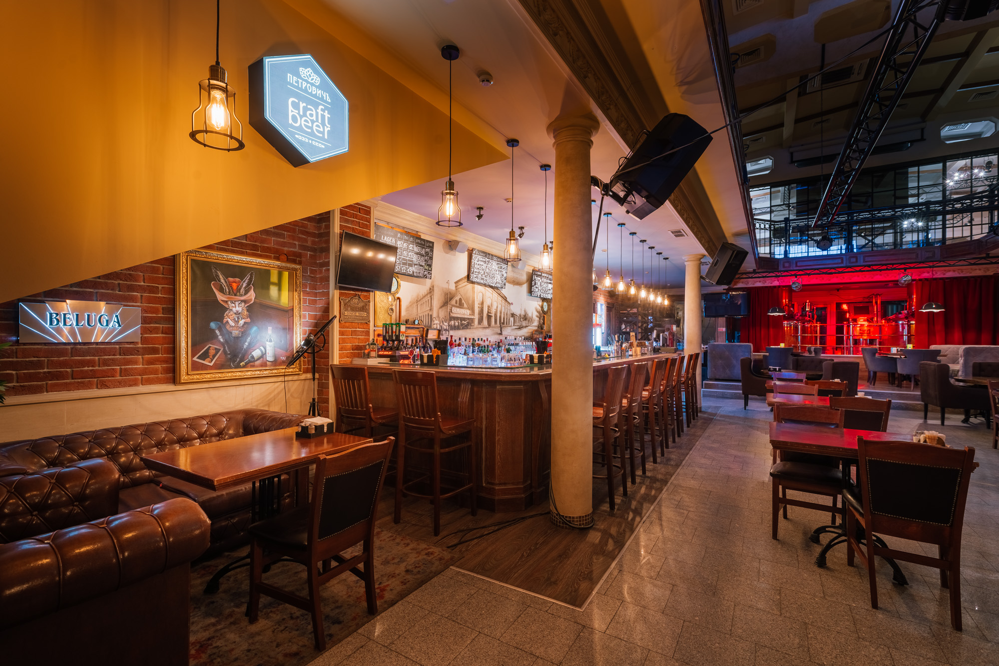 Двухуровневый паб в стиле промышленного лофта представляет собой уникальное мультиформатное пространство. Центром притяжения является действующая пивоварня Петровичъ, полный ассортимент которой представлен в пивной карте. По будням, в камерной атмосфере паба любят проводить как романтические свидания, так и шумные встречи друзей. В банкетном зале из белого кирпича празднуют свадьбы, дни рождения, а также корпоративные мероприятия от кофе-брейков до масштабных конференций.